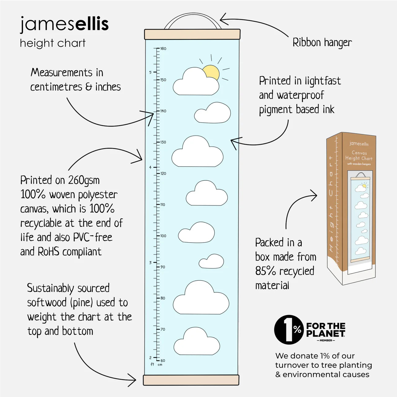 A high quality canvas height chart with wooden hangers, illustrated by Linda Tordoff. The chart features cute illustrations of ballet dancing bunnies and mice. The measurements on the side of the chart start at 60cm / 2ft and go up to 160cm / 5ft 3in.