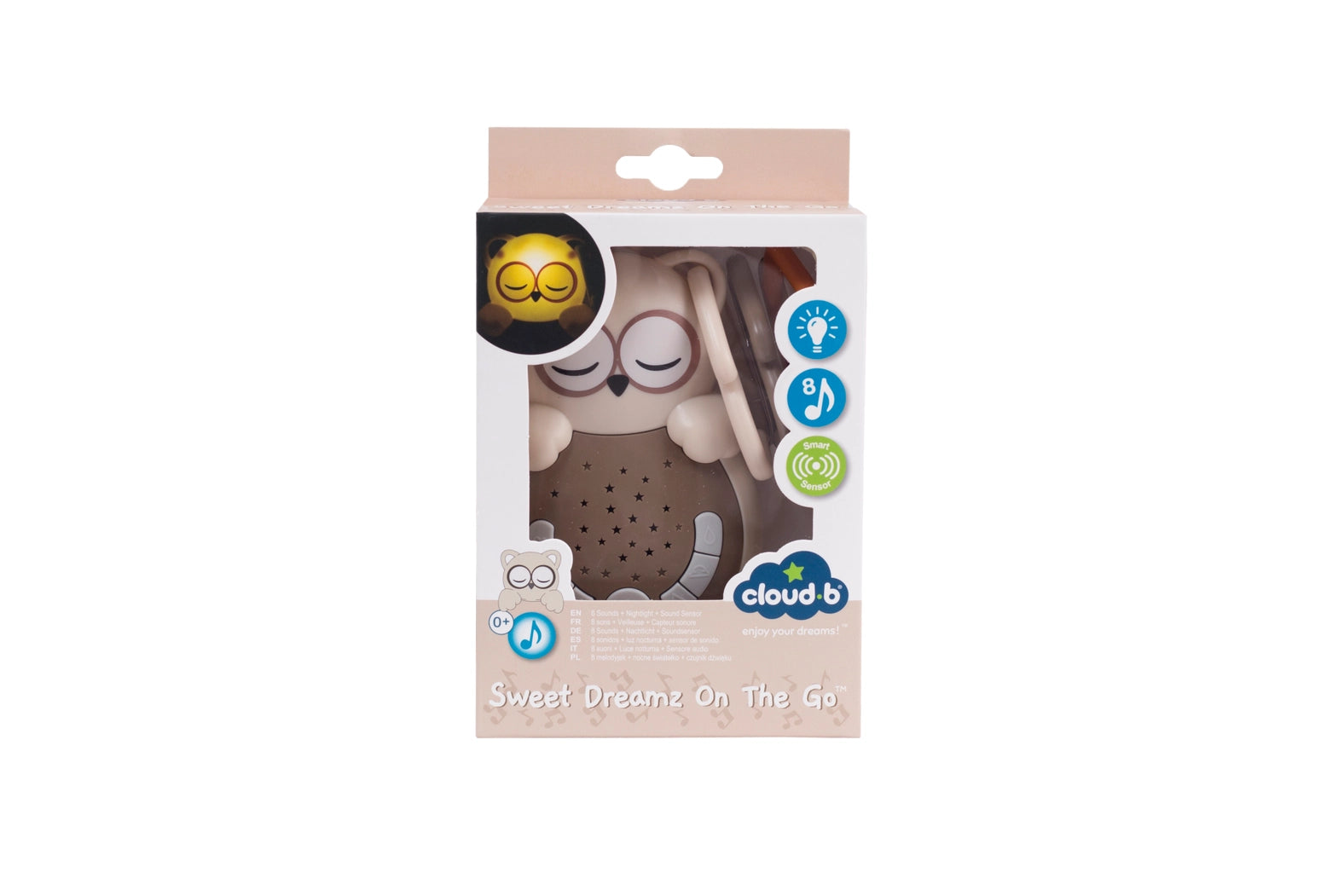 Sweet Dreamz On the Go™ - Travel and On-the-Go Night Light and Sound Soother - Owl. Sweet Dreamz On the Go™ - Dog: This fluffy travel companion features four different nature sounds to calm kids and promote peaceful sleep. Three different modes allow you to select the perfect setting while calming babies and easing them to sleep, wherever bedtime may land. Sweet Dreamz On the Go™ - The dog includes a Smart Sound Sensor. If your baby wakes up and makes any sound, the sensor restarts the music to help the baby fall back asleep. To help preserve the battery, the unit has a 15-minute auto shut-off timer for the nightlight and a 45-minute auto shut-off timer for the sounds and lullabies. The heart-shaped clip allows you to attach the dog everywhere.