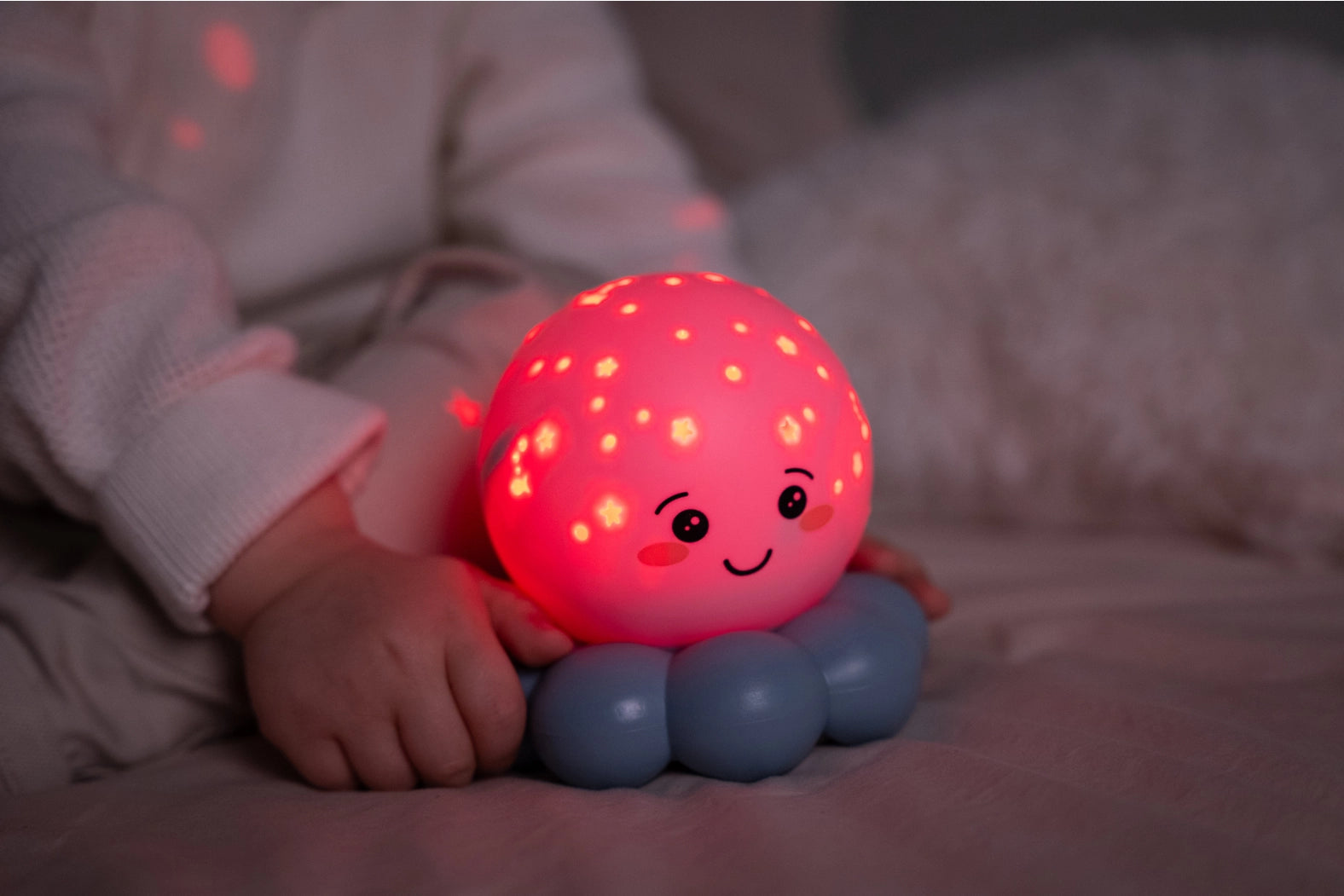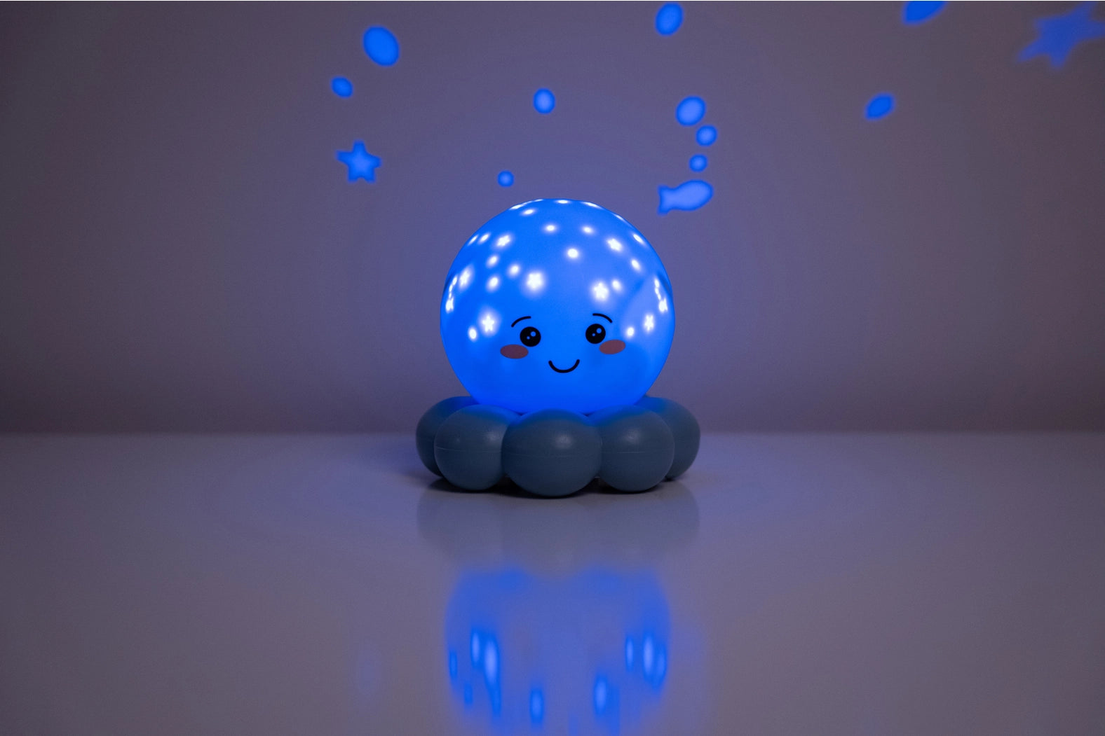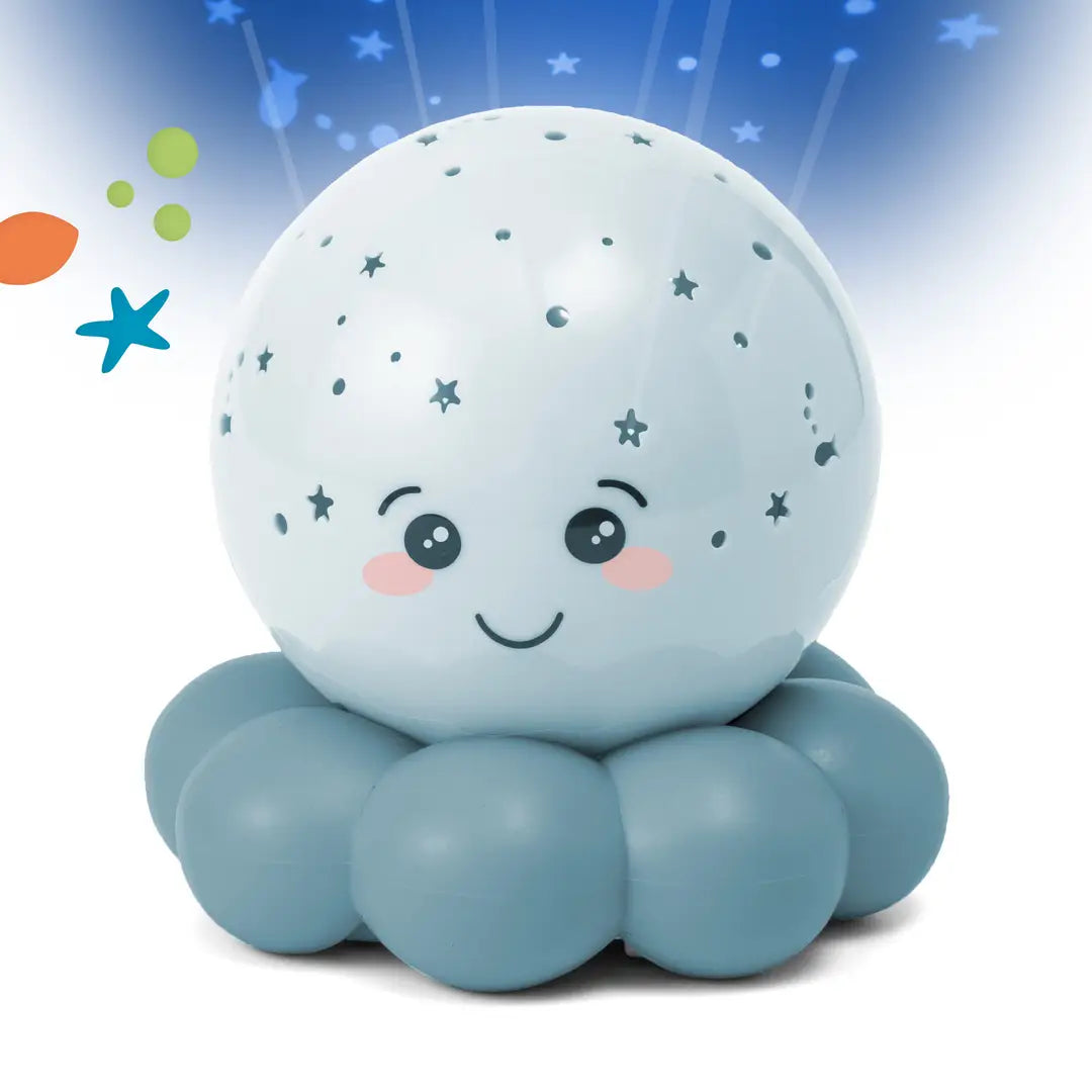 Twinkles To Go Octo™ was made for traveling, transforming any dark, scary new place into an underwater dreamland and making your little bug feel all snug and sleepy. Our bubbly octopus night light is bound to be an absolute must-have for traveling families - whether in the backseat, or the hotel suite! Twinkles glows soft bubbling fish and stars night after night. Twinkles features LED lights that keep the Octo's body cool, safe and long-lasting. And, with no cords to tangle with, Twinkles is always ready to travel. This incredibly lightweight, traveling nightlight has one on/off button. Press the button twice to change colour setting. After 45 soothing minutes of stars and fish, an auto shut-off feature turns Octo off. Sleep is just a little bit sweeter with this glowing octopus who encourages quality, restful sleep. Bring all the comforts of home on the road with Twinkles To Go Octo™!
