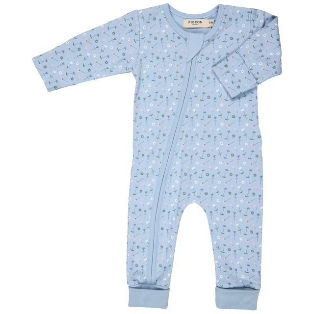 Zip-up romper with opening from top to bottom for easy changing. Built-in scratch mitts, and folded leg cuffs to allow for extra growth.