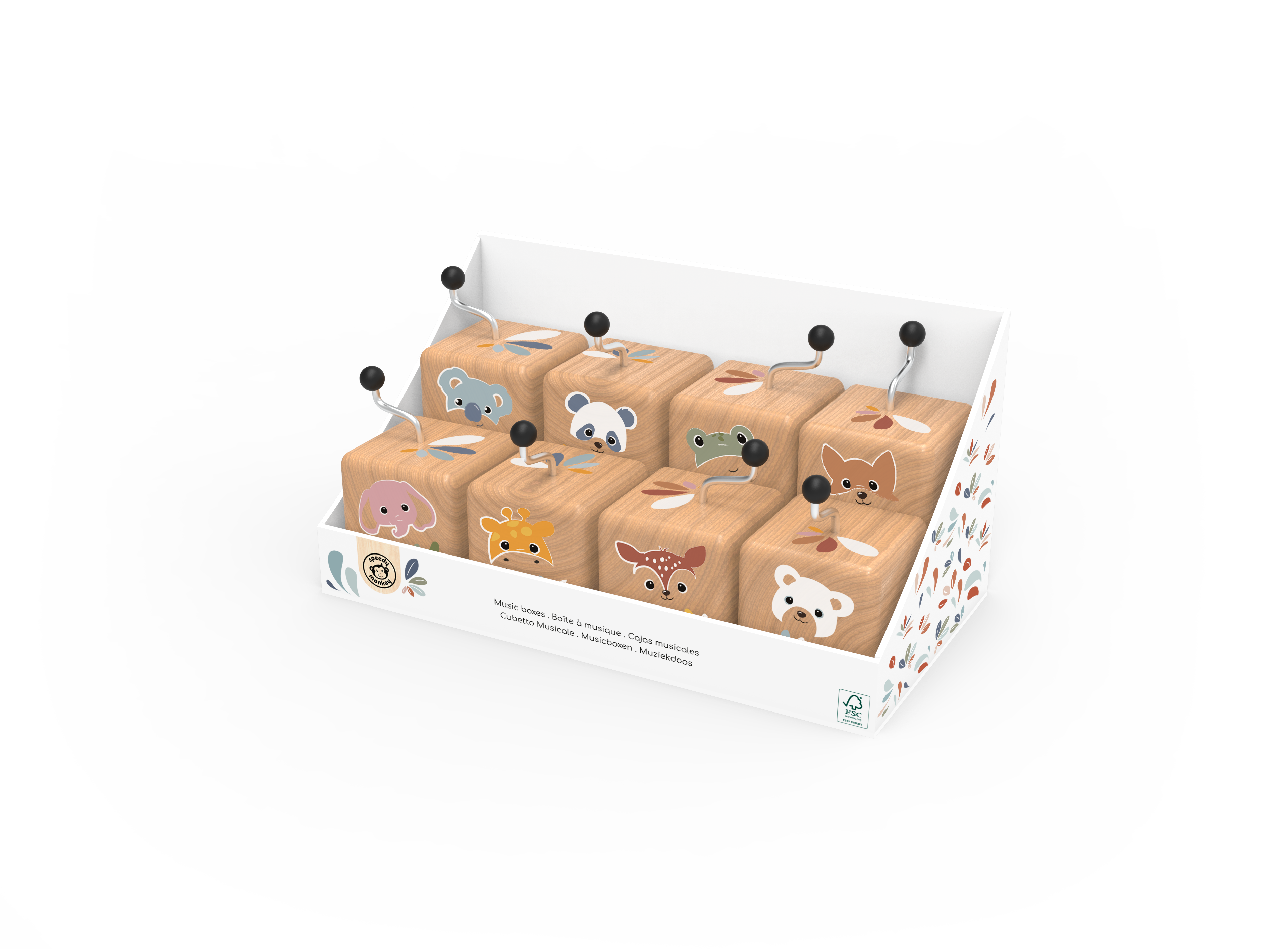 Introducing Music Boxes! Let the Music Boxes bring rhythm and a little magic into your child's everyday moments! Let your little one discover the magic of music with these charming Music Boxes, specially designed for toddlers 24 months and up. A delightful blend of sound and movement, these beautifully crafted wooden boxes captivate young minds while encouraging sensory development and imaginative play. Each box plays a soothing melody when wound up, accompanied by gently twirling figures that bring joy and wonder to every spin. Perfect for bedtime routines, quiet play, or simply adding a touch of magic to your child's room decor. Crafted from FSC-certified wood and finished in multicolor, non-toxic paint, the Music Boxes are safe, sturdy, and eco-friendly. Their compact design makes them ideal for little hands to explore, and they double as charming keepsakes.